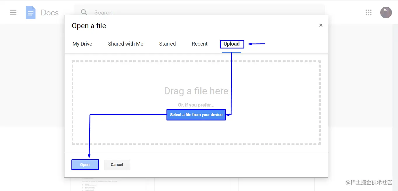 第3步: 点击 "上传"选项,从你的系统中选择所需的PDF,并点击 "打开"。