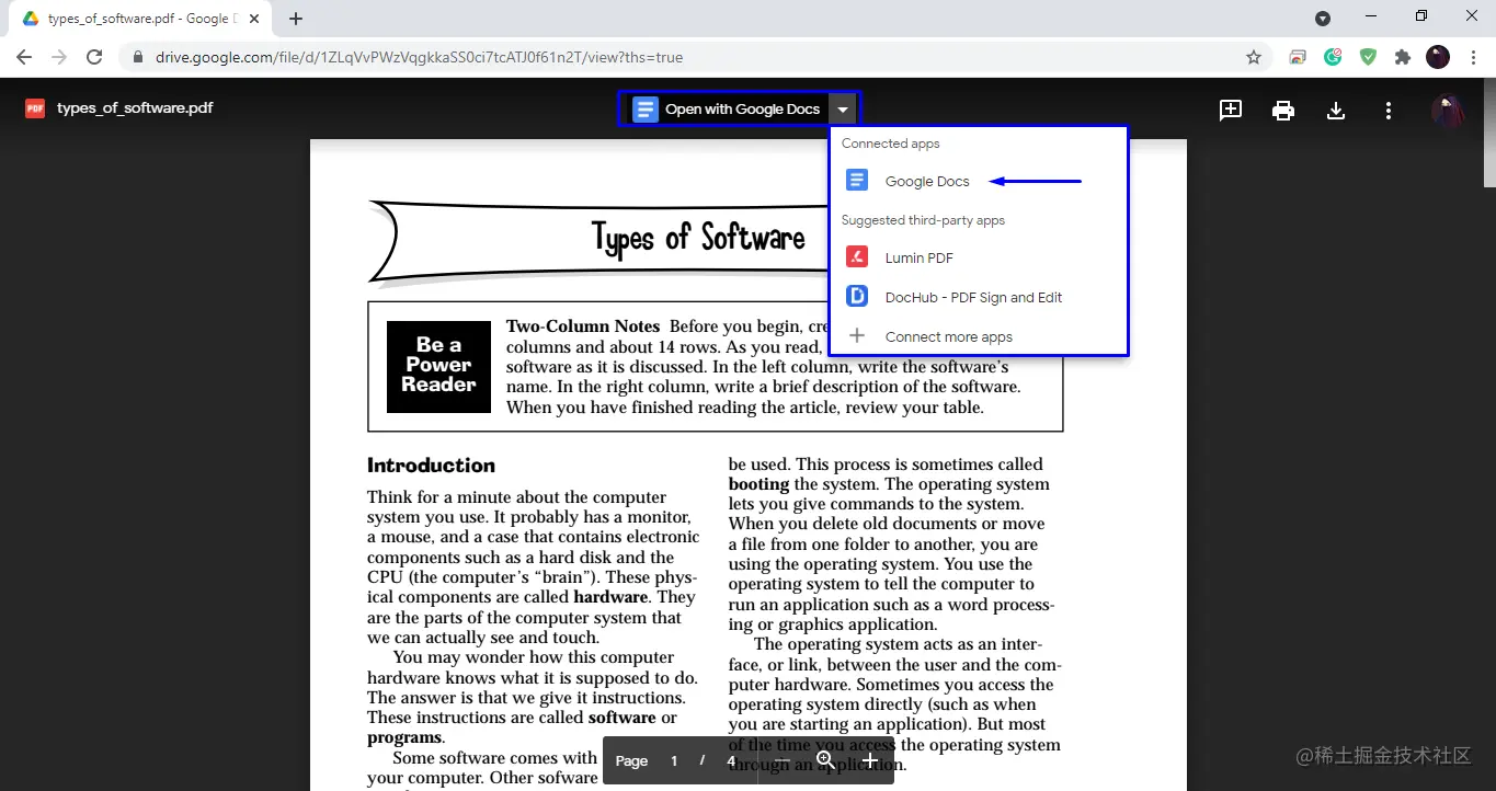**第4步:**正如你所看到的,PDF文件被打开。现在从菜单中选择 "**Google Docs "**选项。这个动作将让你转换你打开的PDF文件到Word文档。