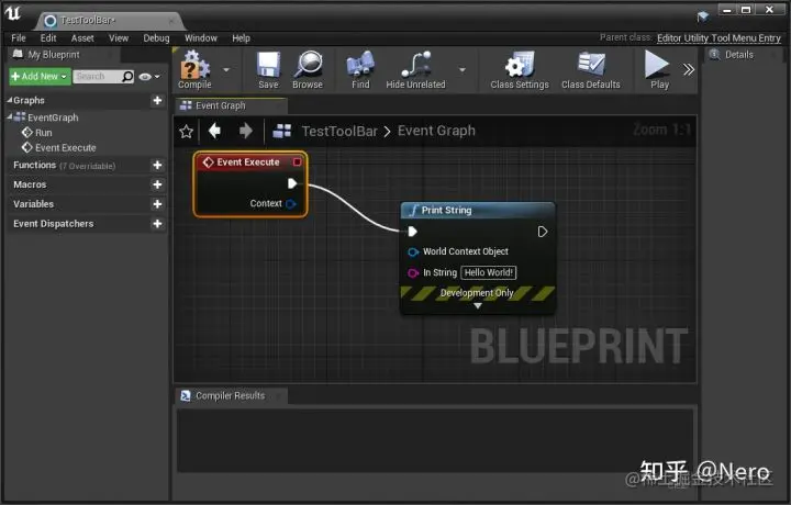 在蓝图编辑器中,将鼠标定位到左侧的 Functions 旁边的 Override 上,并点击 Execute 来编辑自己的逻辑,本例仅用了 PrintString 函数