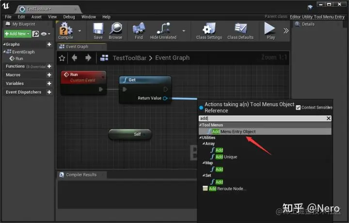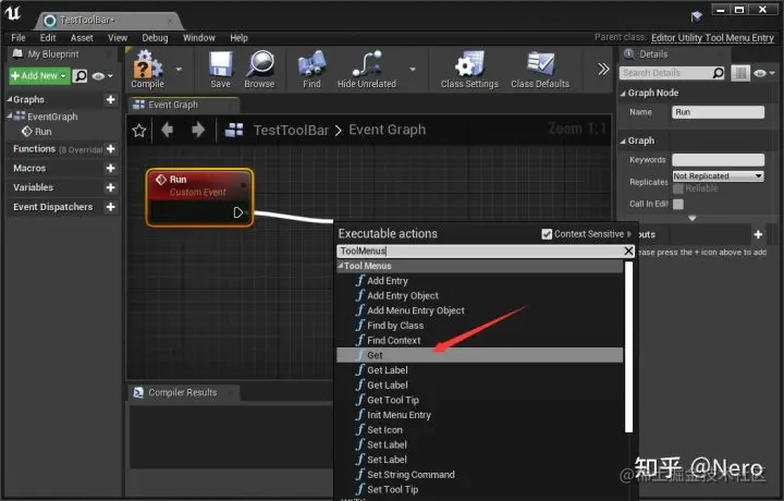 在蓝图编辑界面右键添加一个名为 Run 的自定义事件,按住鼠标拖动 Run 的执行引脚放开后找到 ToolMenus 下面的 Get 方法,然后拖动 Get 的 ReturnValue 执行引脚,找到 AddMenuEntryObject 方法