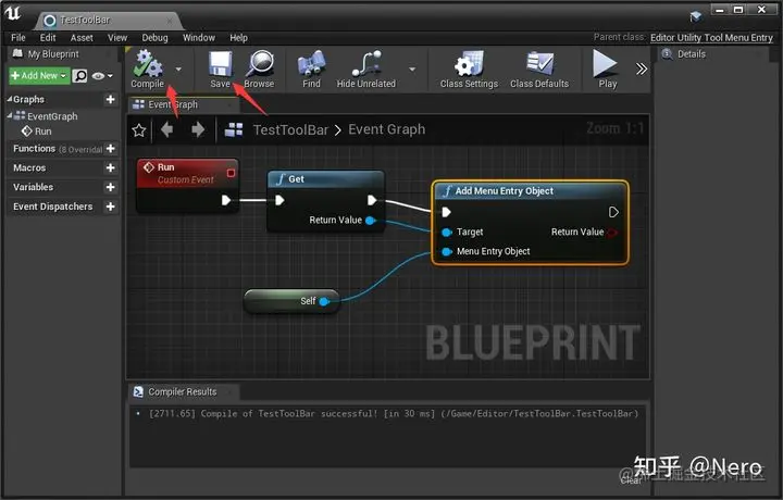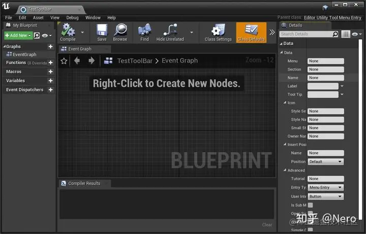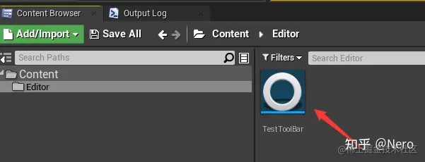 选择 EditorUtilityToolMenuEntry 之后会生成一个 TestToolBar.uasset 的文件,然后双击打开编辑界面