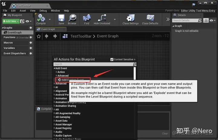 继续上面的步骤,我们需要添加 Run 自定义事件,用它来在 UE4 编辑器启动的时候注册这个按钮