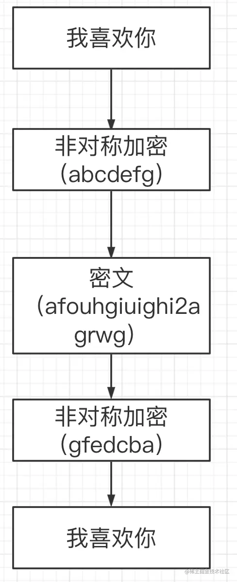 A和B都通过公钥的方式进行数据传输。A讲要发送的“我喜欢你”通过公钥加密成一股密文发送给B,B在通过公钥解密密文进行传输。