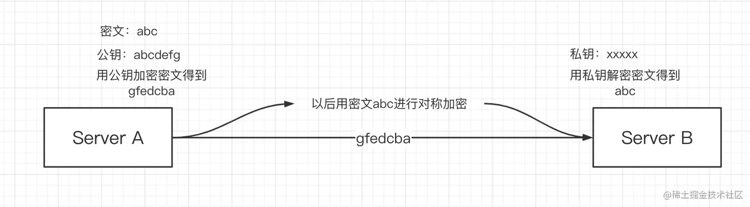 - A自己做一个秘钥,然后通过B的公钥加密秘钥变成密文然后发给B