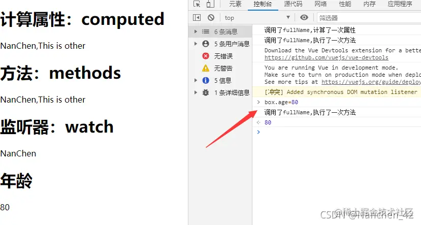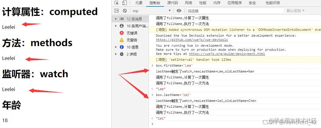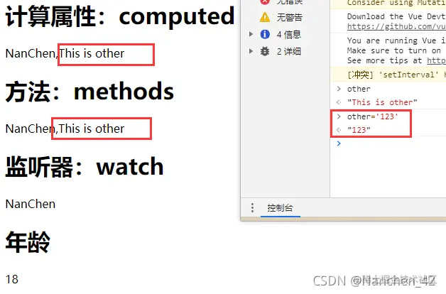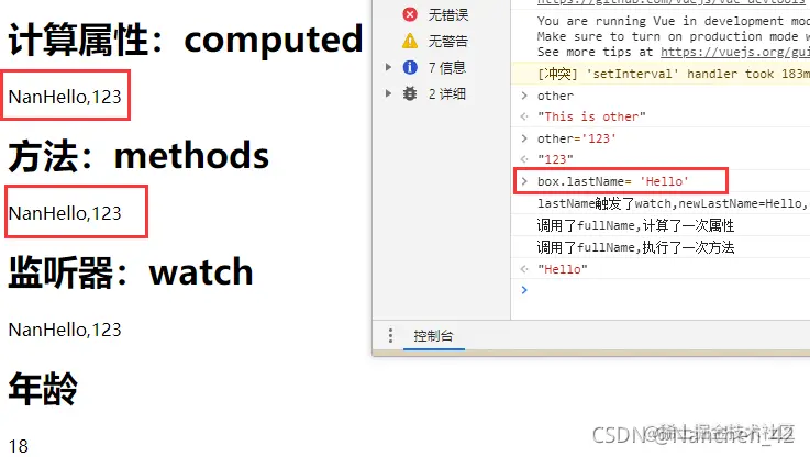 缓存功能,当firstName和lastName都不改变的时候,fullName不会重新计算,比如我们改变age的值,fullName的值是不需要重新计算的。 - methods并没有缓存特性,比如我们改变age的值,fullName2()方法会被执行一遍。