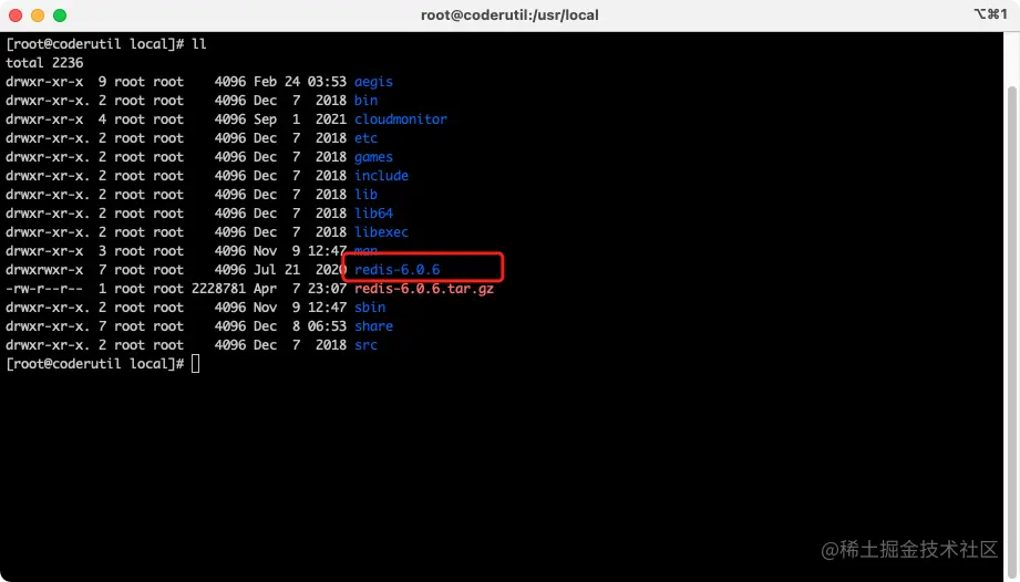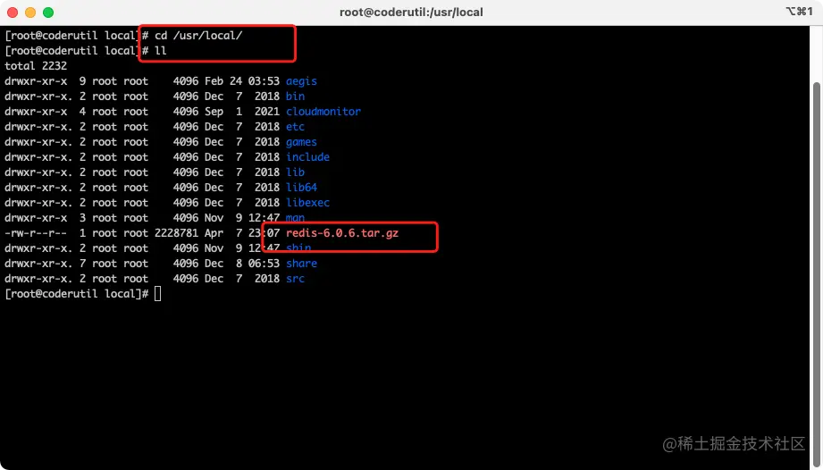 - 输入ll命令,查看/usr/local目录,看是否解压成功