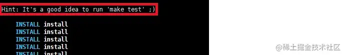 如果出现如上图所示,提示"Hint: It's a good idea to run 'make test' ;)",代表安装成功!