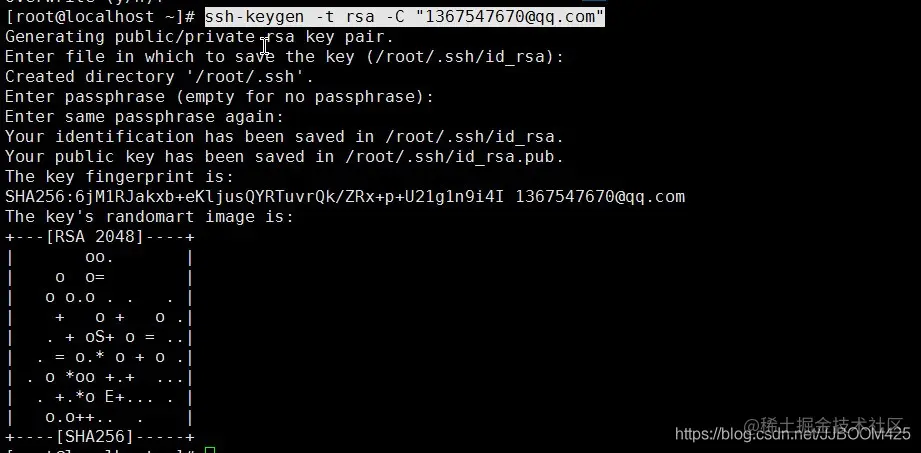 中间要求输入时候直接回车即可。看到最后结果说明SSH Key已经成功生成。