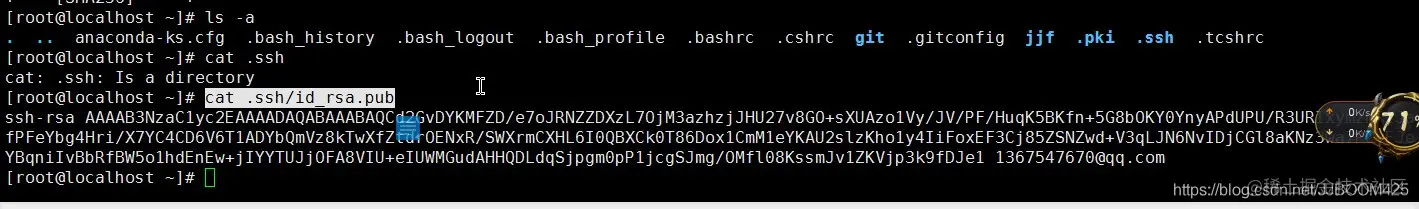 创建好的SSH Key我们要在 ~/.ssh 目录下查看,设置好会多出两个文件 id_rsa 和 id_rsa.pub,其中id_rsa 是私钥,id_rsa.pub 是公钥。一定要记得私钥不能随便给别人。 下面可以cat输出看看生成的公钥: