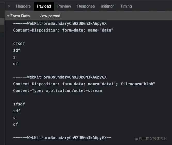2、multipart/form-data 当需要想服务器提交文件时,就需要使用这种方式。前面代码中我们可以看到当formData是普通文本是会被修正,为了解决这个情况我们可以将string内容封装到Blob中作为文件流传输,来避免修正。 这样传输,服务端会以文件方式收到内容,直接读取Stream内容;对于压缩文本,这种处理方式最优。