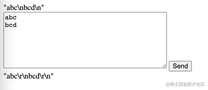 我们来写个简单Demo测试一下。先在页面上放一个允许换行的textarea, 输入带换行的文本,获取内容看到只有\n转译。通过FormData直接post数据到服务端,然后直接返回,看到\n全部变成了\r\n。