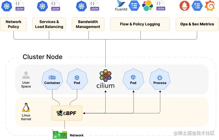 Cilium 基于一种名为 eBPF 的新 Linux 内核技术,可以在 Linux 内部动态插入强大的安全性、可见性和网络控制逻辑,不需要更新应用代码或重启服务本身就能实现强大的安全可视化功能。除了提供传统的网络级安全性之外,eBPF 的灵活性还可以在 API 和进程级别上实现网络安全管理,以保护容器或容器内的通信。[3]
