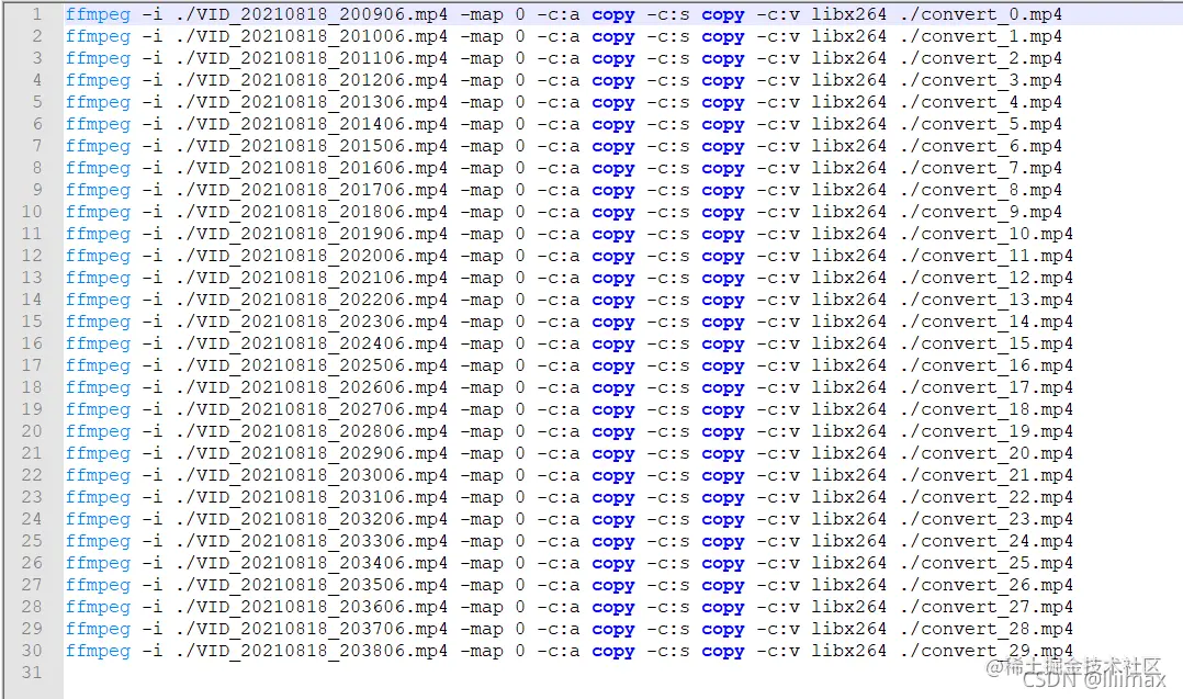 命令: ffmpeg -i ./VID_20210818_201006.mp4 -map 0 -c:a copy -c:s copy -c:v libx264 ./0.mp4