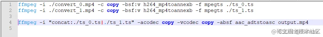 命令: ffmpeg -i "concat:./0.ts|./1.ts|./2.ts" -acodec copy -vcodec copy -absf aac_adtstoasc output.mp4