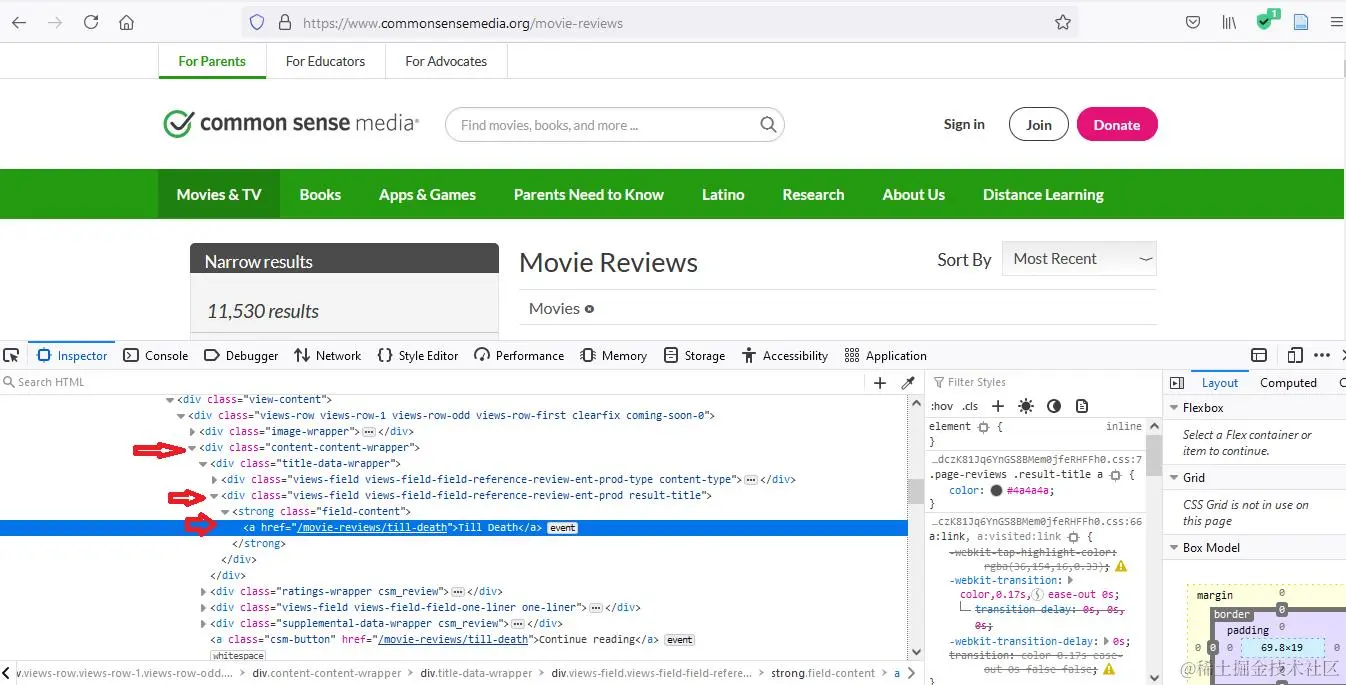 当你检查这个元素时,你会注意到我们要找的东西--电影标题 "至死不渝"--包含在一个类别为 "content-content-wrapper "的 "div "标签中。这个第一个 "div "标签将在整个html代码中不断重复出现,因为每个电影标题都包含在这样一个 "div "标签中。于是我们说,对于div中的每个div,我们希望选择子 "div "标签,其类别为 "views-field views-field-reference-review-ent-prod result-title"。之后,我们看到一个 "strong "标签,类别为 "field-content"。所以我们又做了同样的事情。最后,我们的标题本身与一个 "a "标签嵌套,所以我们选择 "a "标签。