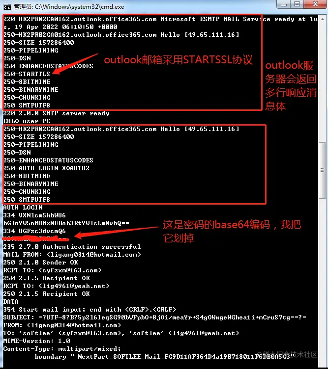 至于为何是base64编码,可能是SMTP协议设计时考虑到用户名和密码的重要性,所采用的最简单的“加密”手段。虽然base64只是编码方式,不是加密方式,但在早期控制台输入命令的情况下,别人还是一下无法像记住明文一样记住这些无规律的base64编码。不过随着SSL的应用,这些都已不重要了。