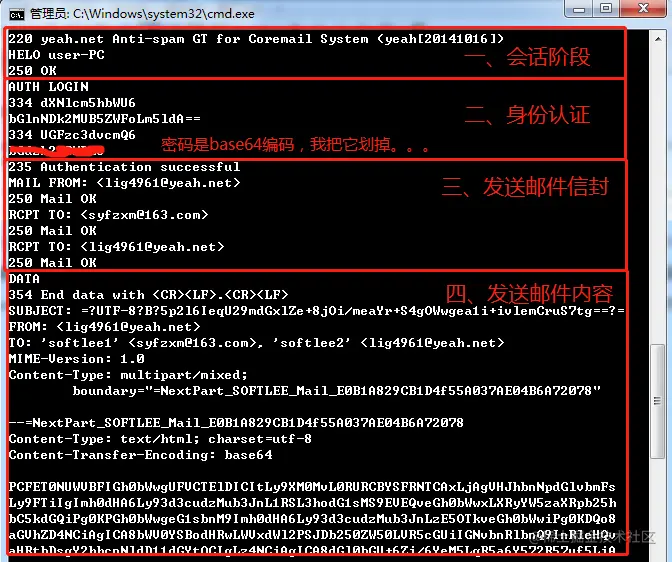 这一步中账号和密码需要进行base64编码,包括服务器发来的提示信息也是base64编码。 首先发送AUTH LOGIN命令,服务器会返回“334 XNlcm5hbWU6”,“dXNlcm5hbWU6”解码后为“username:” UGFzc3dvcmQ6解码为"Password:" 也就是提示用户输入用户名和密码。认证成功后返回235,注意返回的不是二百五(250)哦。 接着根据服务器返回的提示,发送账号(发件人的邮箱账号)和密码。