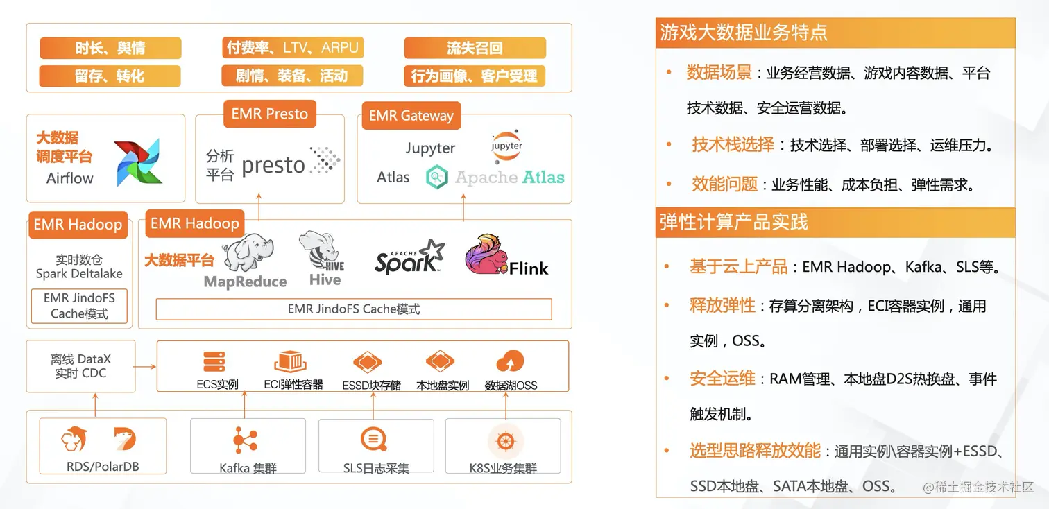 从部署架构来看,不同的游戏公司处在不同的数据建设阶段,会有不同的选择倾向,包括完全自建、基于云自建大数据、基于云上托管、以及利用更多云上成熟的产品技术去丰富整体的大数据能力集,而后者也成为越来越多客户的选择。