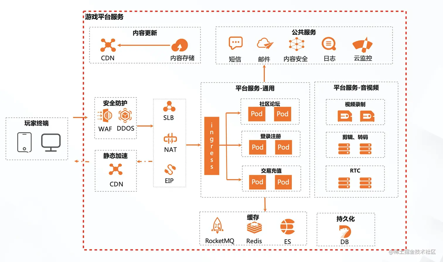 游戏平台(不限于FPS、MOBA类)主要提供的服务:官网、客服、注册、登录、充值、兑换、商城、推送、公告、社区、SDK及邮件、短信等公共服务;包括内容审核、视频录制、弹幕、转码、剪辑、RTC这些业务需要的基础服务,以及运维监控、发布平台、测试平台这些运维等平台服务。