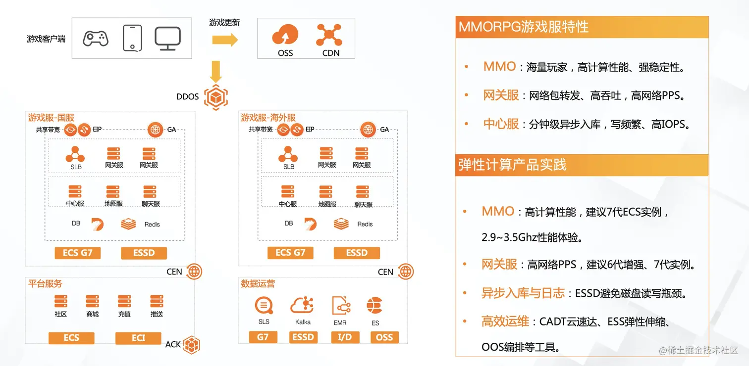 (1)MMO游戏服性能与稳定需求,建议使用最第7代ECS实例,根据实际需求选型c计算型(CPU与内存配比1:2)/g通用型(1:4)/r内存型(1:8),Intel Ice Lake 2.9GHz基频3.5GHz睿频提供超高性能,能更好地优化游戏体验。