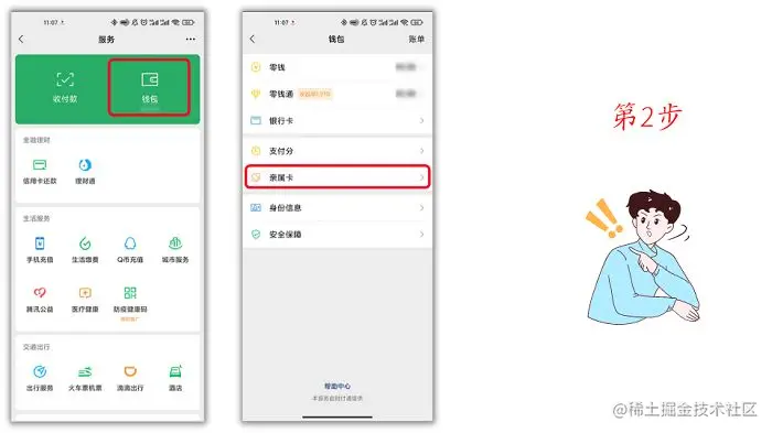 第2步:随后进入里面的钱包,就有个“亲属卡”在里面,我们点进去;