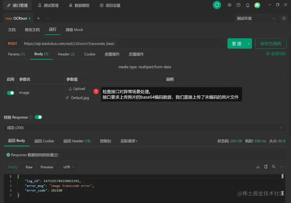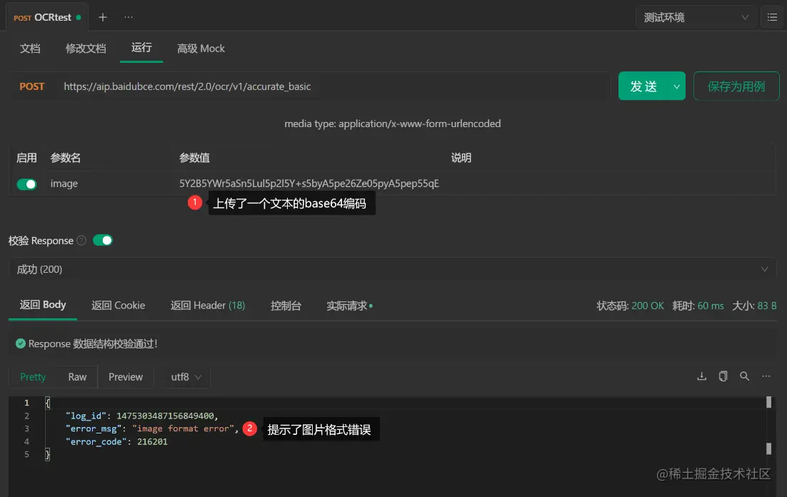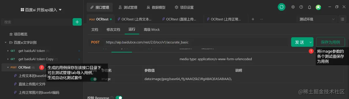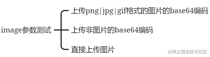 根据请求参数,上传jpg,png,gif等格式的正常测试数据,再上传非图片的base64编码数据进行测试,查看请求返回。 以该接口image参数测试的部分用例来作为例子: