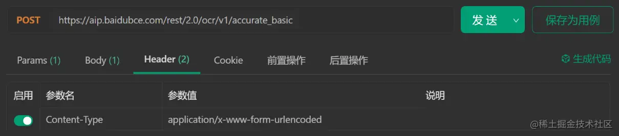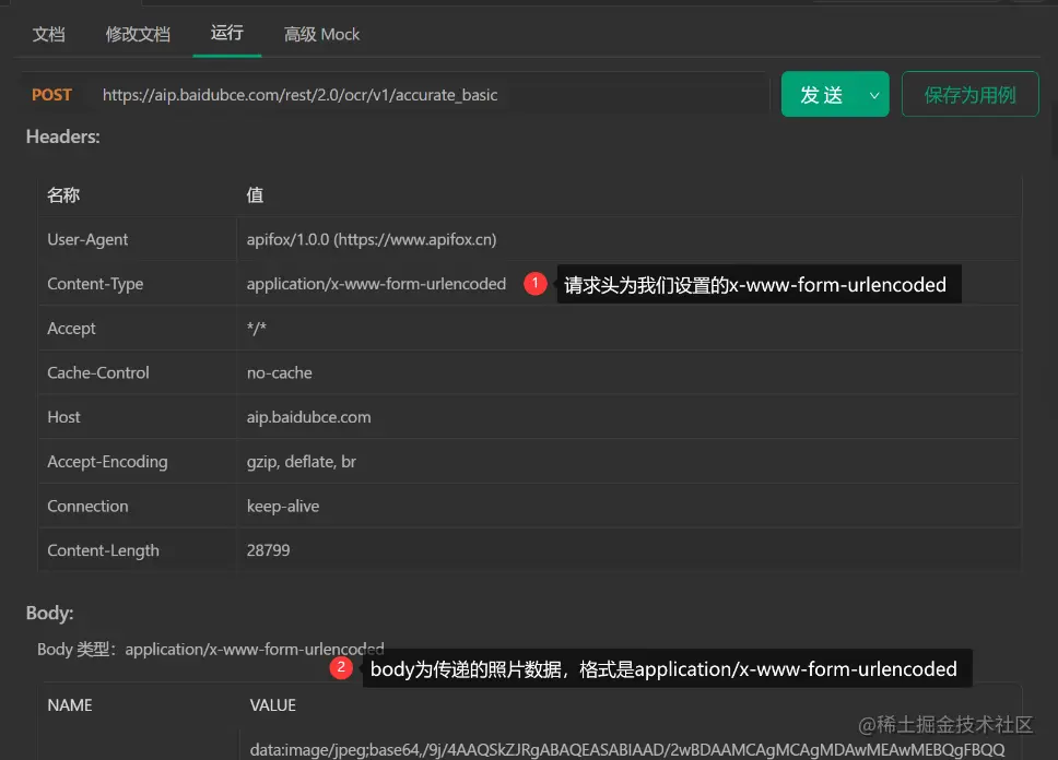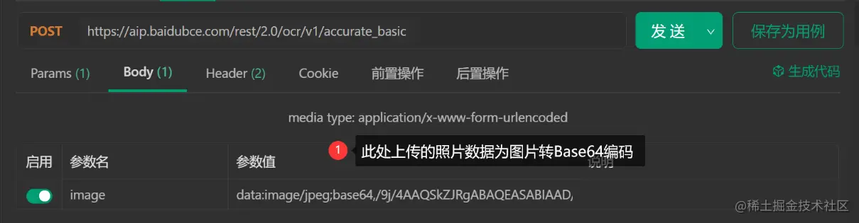 1.application/x-www-form-urlencoded 原生的form表单,在body中的数据格式为键值对。下图所示为百度文字识别AI的一个POST请求接口,测试这个请求接口需要填入的数据有2项。