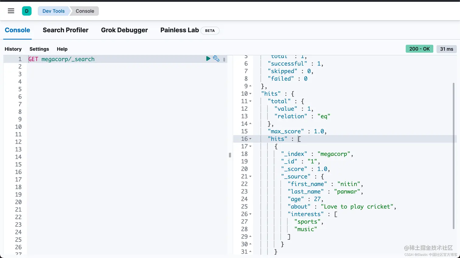[{'_index': 'megacorp', '_id': '1', '_score': 0.6931471, '_source': {'first_name': 'nitin', 'last_name': 'panwar', 'age': 27, 'about': 'Love to play cricket', 'interests': ['sports', 'music']}}]
