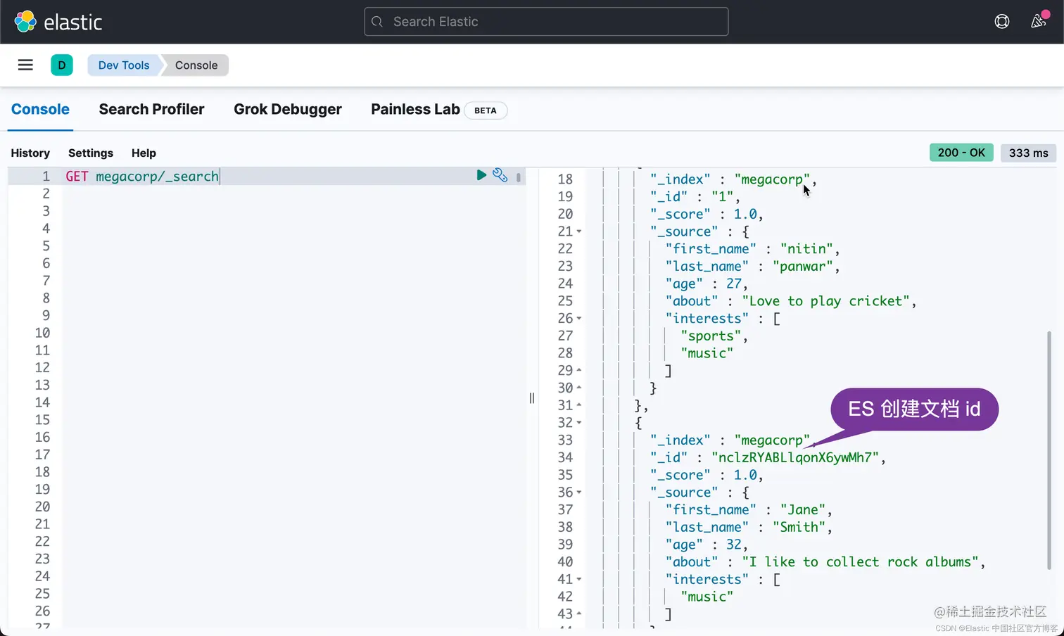 我们可以看到第一个文档的状态是 updated,而第二个文档的状态是 created,也就是说第一个文档被更新,而第二个文档是被创建。我们可以通过 Kibana 来查看: