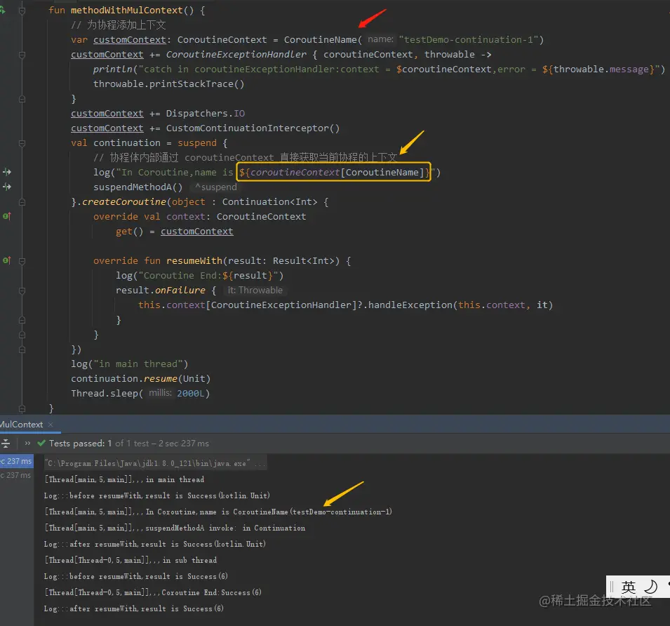 - 为上下文添加一个拦截器 ContinuationInterceptor:那么每一次对 Continuation.resume()/resumeWith() 的调用都会被拦截和处理。
