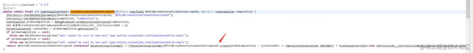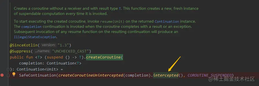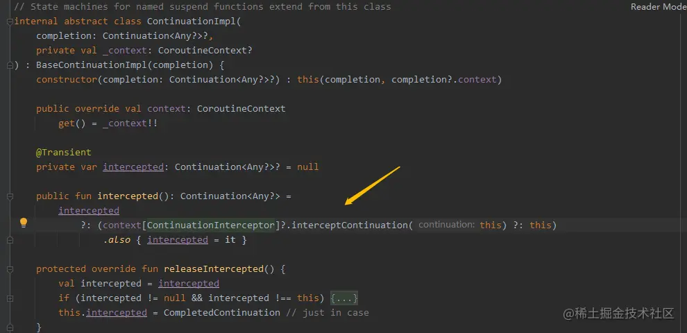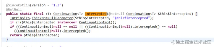 - 由于截图可知,这里其实调用了一个函数 .intercepted(),目的(不一定对,后续会验证)就是为了去获取被拦截器拦截过后的 Continuation 对象。