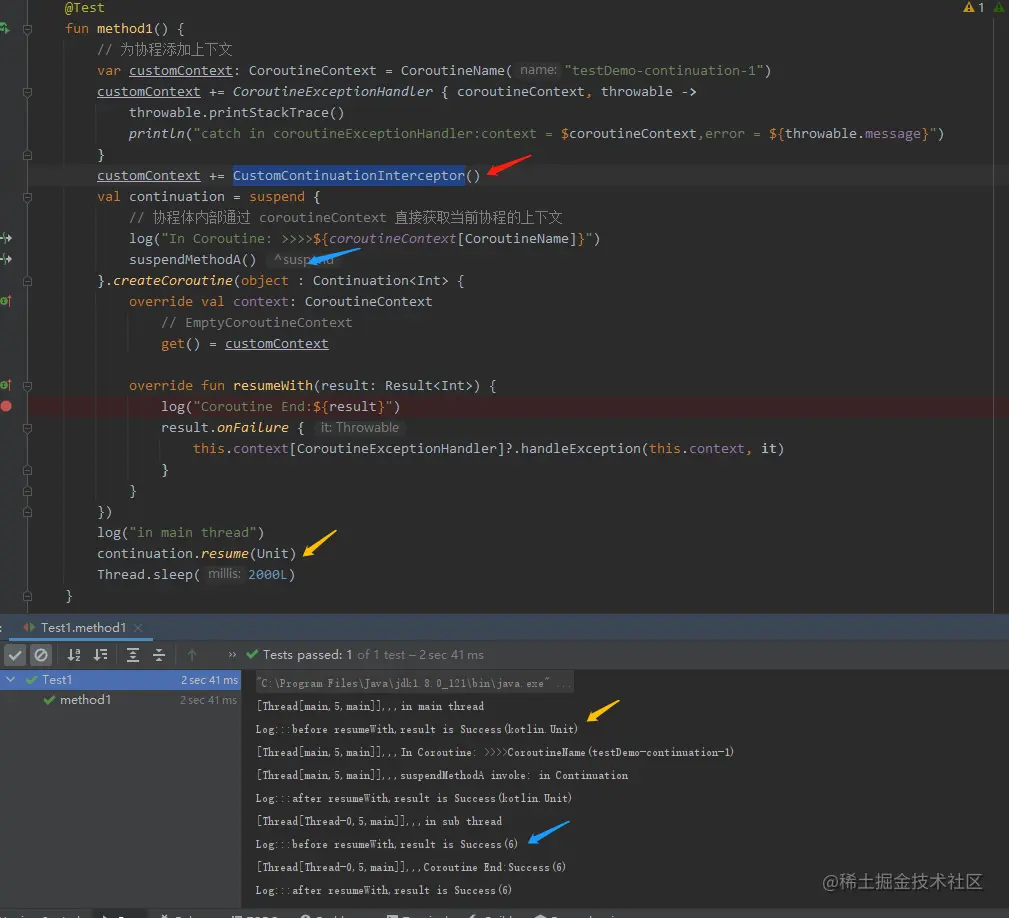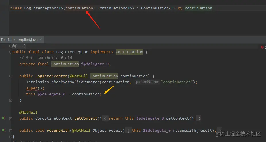 - 这里看回去拦截器的实现:【地址】,一般情况下我们继承拦截器 ContinuationInterceptor ,需要重写实现 interceptContinuation() 方法。通过重写,返回一个新的包装类对象 XXXContinuation,通过该包装类,在里面去实现拦截处理。比如示例中我们对 resumeWith() 进行了拦截和打印。