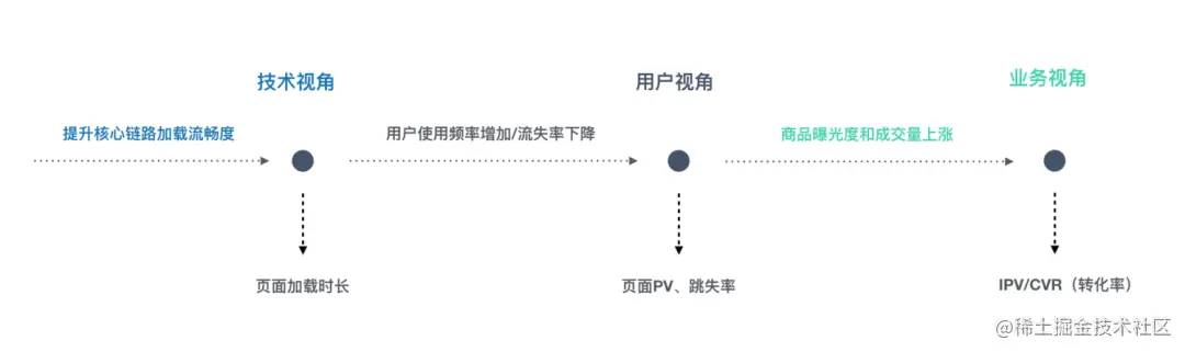 为了有更立体的衡量标准,有了如下设想:页面加载速度和流畅度提升(技术视角)-> 用户跳失率下降(用户视角)-> 商品曝光和点击上涨(平台视角)