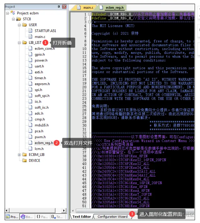 方法: 在 Keil 左侧的 LIB_LIST 下找到 ecbm_reg.h,双击打开ecbm_reg.h。然后在窗口的左下角点 Configuration Wizard 标签进入图形化配置界面。