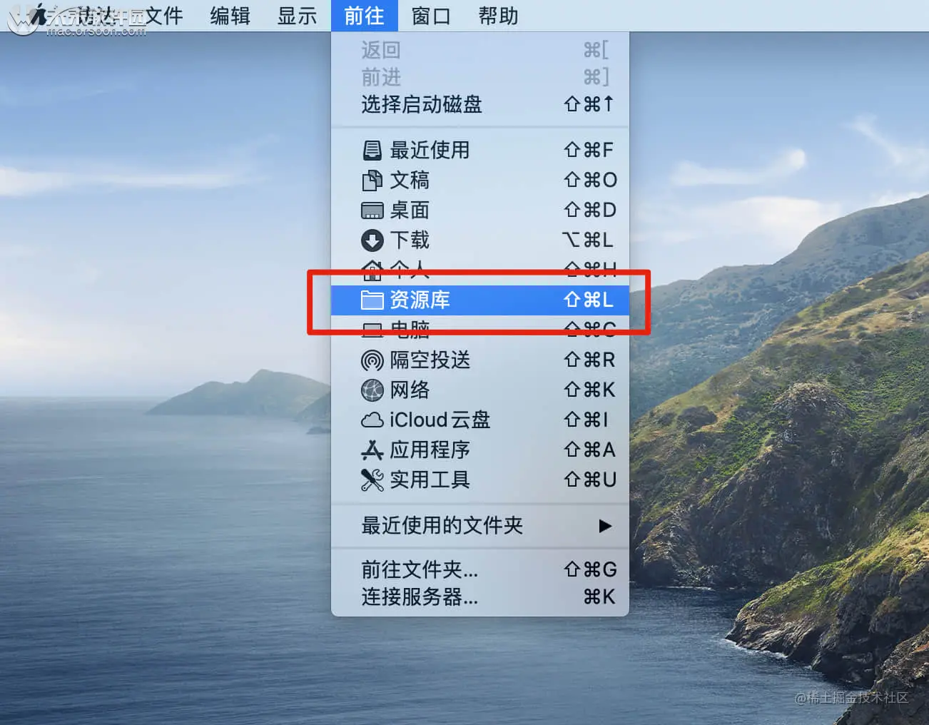 在桌面上按住键前上的option键点击 前往 > 资源库