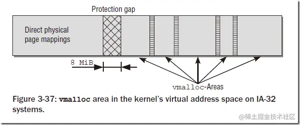 在这部分有一个有意思的事情:vmalloc区域在IA-32中预设的大小是128MB,这部分内存一般会被内核模块使用。vmalloc区域的大小是可以定制的,在新版内核中可以在内核启动选项中加入vmalloc=xxxMB的方式来修改,或者修改内核代码对应的宏:
