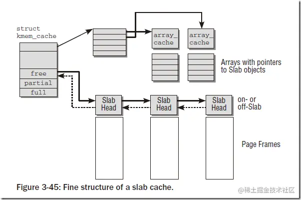 每个slab缓存只负责一种对象类型,或者提供一般性的缓冲区。下图中给出了缓存的精细结构: