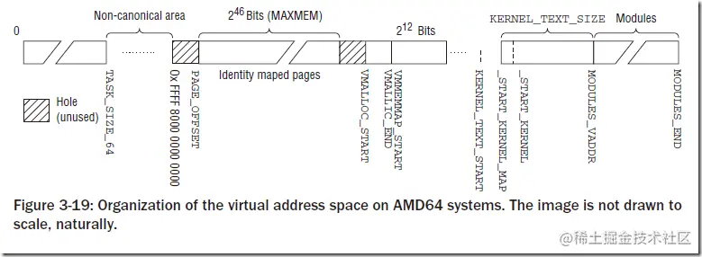 0x0000 7FFF FFFF FFFF和上半部空间0xFFFF 8000 0000 00000xFFFF FFFF FFFF FFFF。可以看到虚拟地址的低47位,即[0,46]为有效位,[47,63]的值总是相同的:或者全为0或者全为1。除此之外的值都是无效的。这样在虚拟内存空间中就将内存分成了两个部分:内存空间的下半部和上半部。下半部为用户空间,上半部为内核空间。我们考虑内核空间部分,下半部的前MAXMEM大小(64TB)为直接映射地址,之后有一个空洞,主要目的是处理内存访问越界;再之后是大小为32TB的VMALLOC空间,在之后是VMMEMMAP空间、KERNEL TEXT段空间以及Modules空间。 -