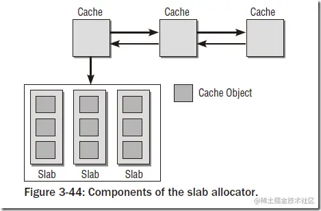 slab分配器由一个紧密交织的数据和内存结构的网络组成,主要可以分为如图的两部分:保存管理型数据的缓存对象和保存被管理对象的各个slab。