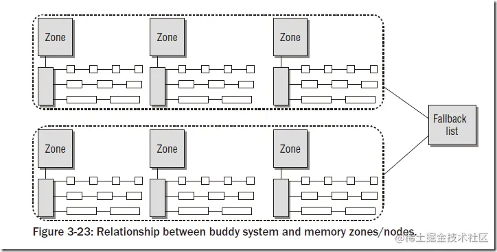 在上文中已经说到,物理内存的惯例分为若干个node,每个node中又有若干个zone。对于每个zone,都会有对应的伙伴系统,如下图所示: