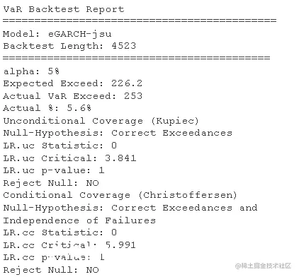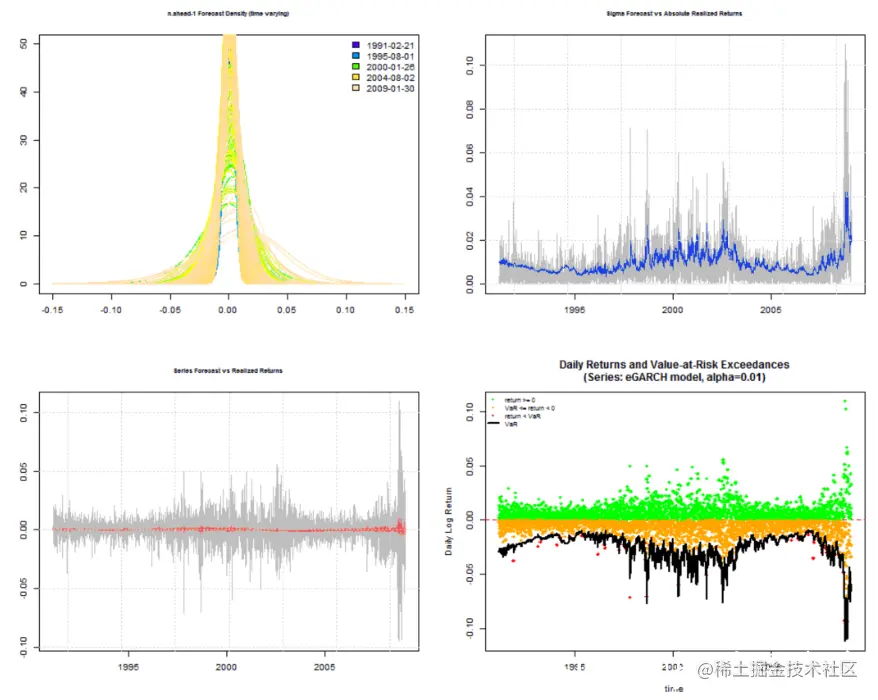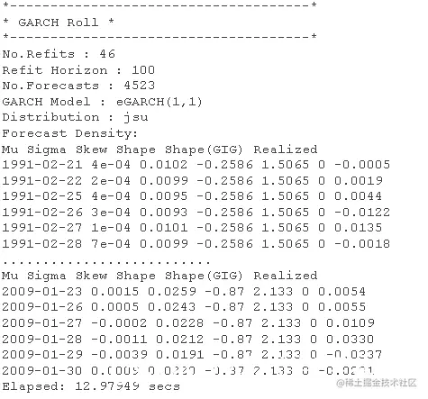 对模型/数据集组合执行滚动估计和预测,可选择返回指定水平的 VaR。更重要的是,它返回计算预测密度所需的任何度量所必需的分布预测参数。以下示例说明了该方法的使用,其中还使用了并行功能并在 10 个内核上运行。