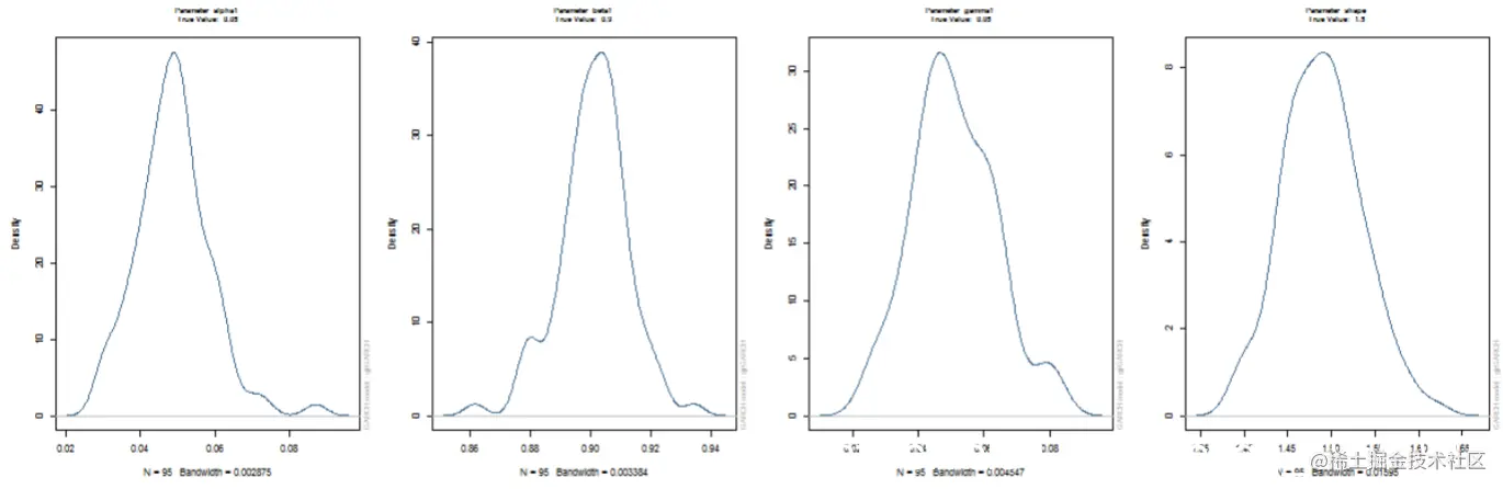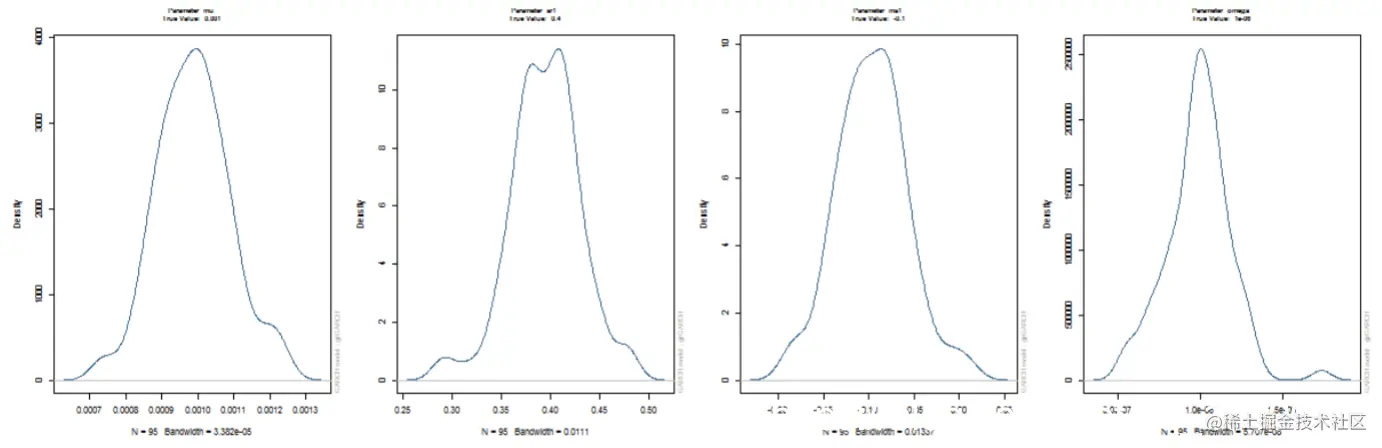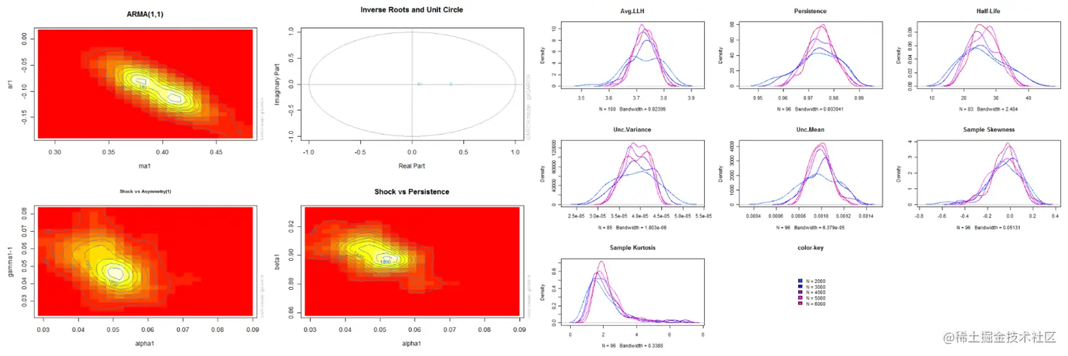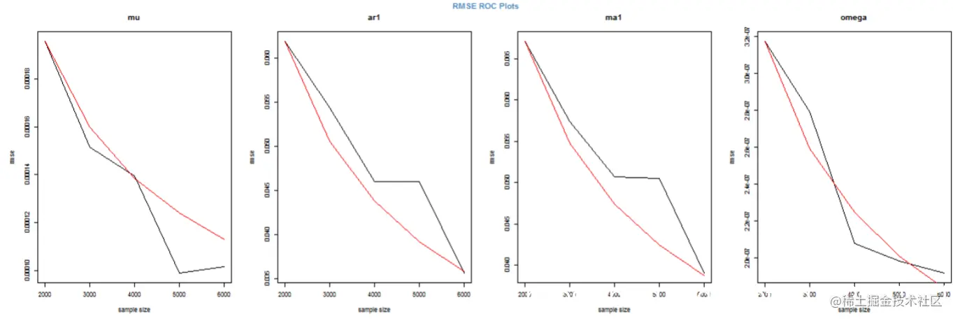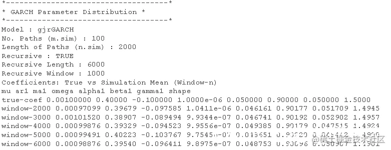 但是,使用 100 个数据点来尝试拟合模型不太可能是一种合理的方法,因为您不太可能获得非常有效的参数估计。提供了一种方法(ugarchdistribution),用于从预先指定的模型、不同大小的数据进行模拟,将模型拟合到数据,并推断参数的分布以及作为数据长度的 RMSE 变化率增加。这是检查参数分布的一种计算成本非常高的方法(但在非贝叶斯世界中是唯一的方法),因此应谨慎使用并在有足够计算能力的情况下使用。
