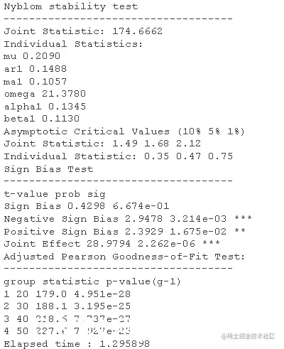 nymblom 检验计算了 Nyblom (1989) 的参数稳定性检验,以及联合检验。显示用于比较结果的临界值,但在超过 20 个参数的情况下,这不适用于联合测试。