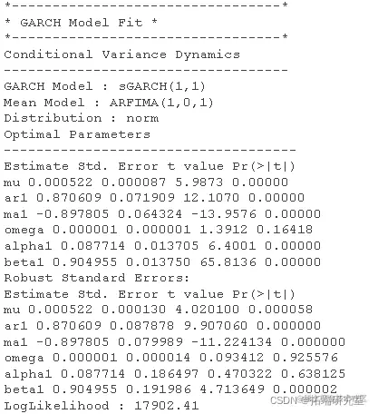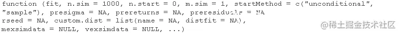 拟合对象属于 uGARCHfit 类,可以传递给各种其他方法,例如 show (summary)、plot、ugarchsim、ugarchforecast 等。