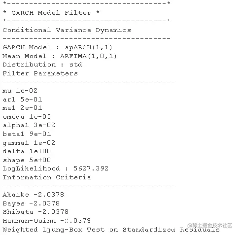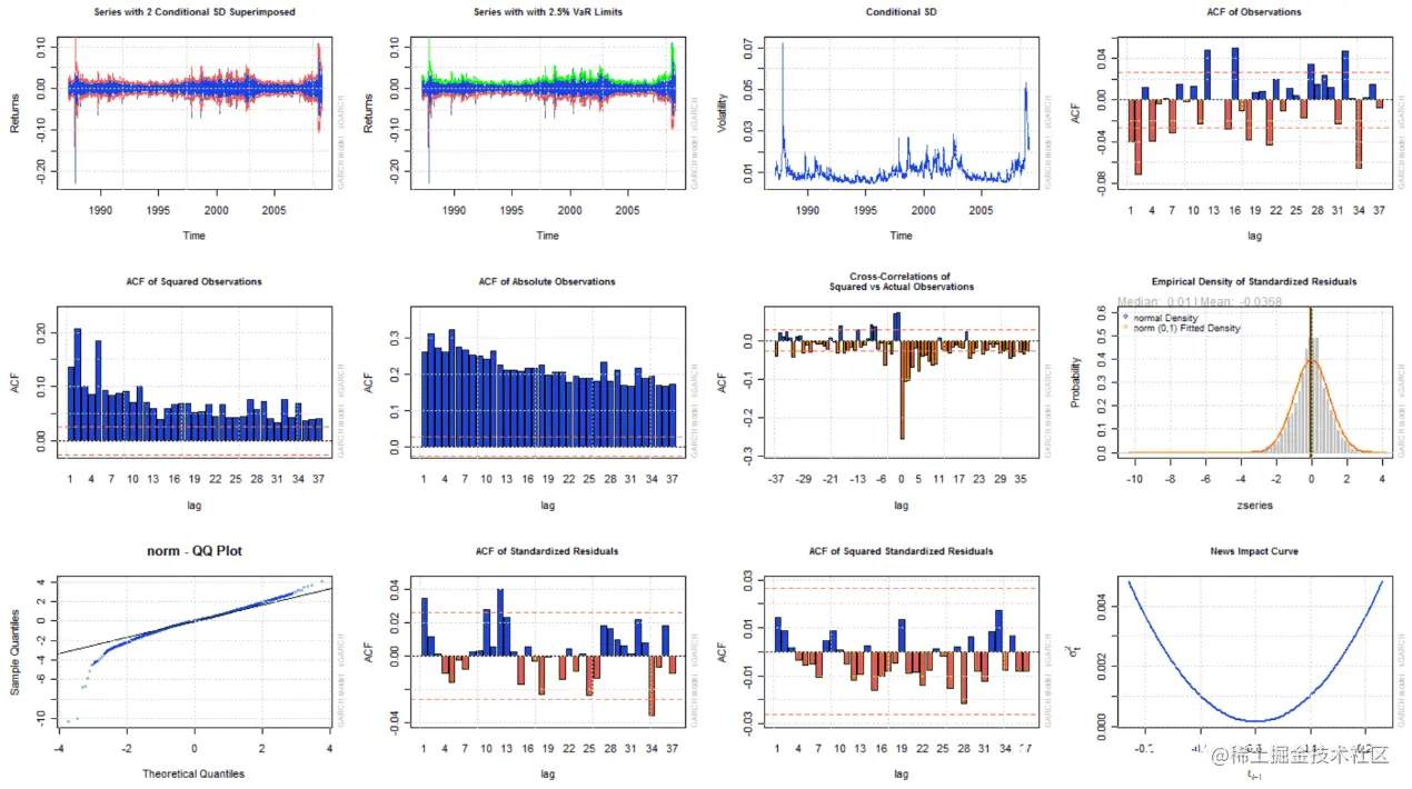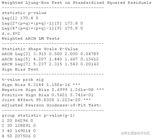 Q-statistics 和 ARCH-LM 检验已被 Fisher 和 Gallagher (2012) 的 Weighted Ljung-Box 和 ARCH-LM 统计量取代,这更好地说明了来自估计模型。ARCH-LM 检验现在是一个加权组合检验,用于检验充分拟合的 ARCH 过程的原假设,而 Ljung-Box 是另一个组合检验,其 ARMA 拟合的充分性为零。signbias 计算 Engle 和 Ng (1993) 的 Sign Bias Test,也显示在摘要中。这测试了标准化残差中杠杆效应的存在(以捕捉 GARCH 模型可能的错误指定),