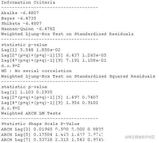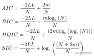 这是最佳分数的Hessian和协方差。稳健标准误差是 V 的对角线的平方根。拟合或过滤对象上的 inforcriteria 方法返回 Akaike (AIC)、贝叶斯 (BIC)、Hannan-Quinn (HQIC) 和 Shibata (SIC) 信息标准,以通过以不同速率惩罚过拟合来启用模型选择。形式上,它们可以定义为: