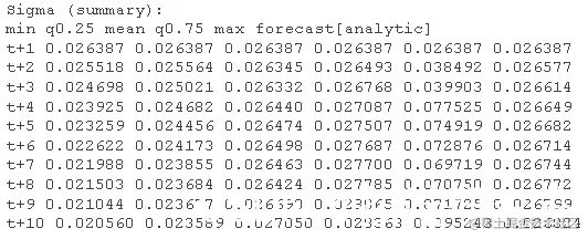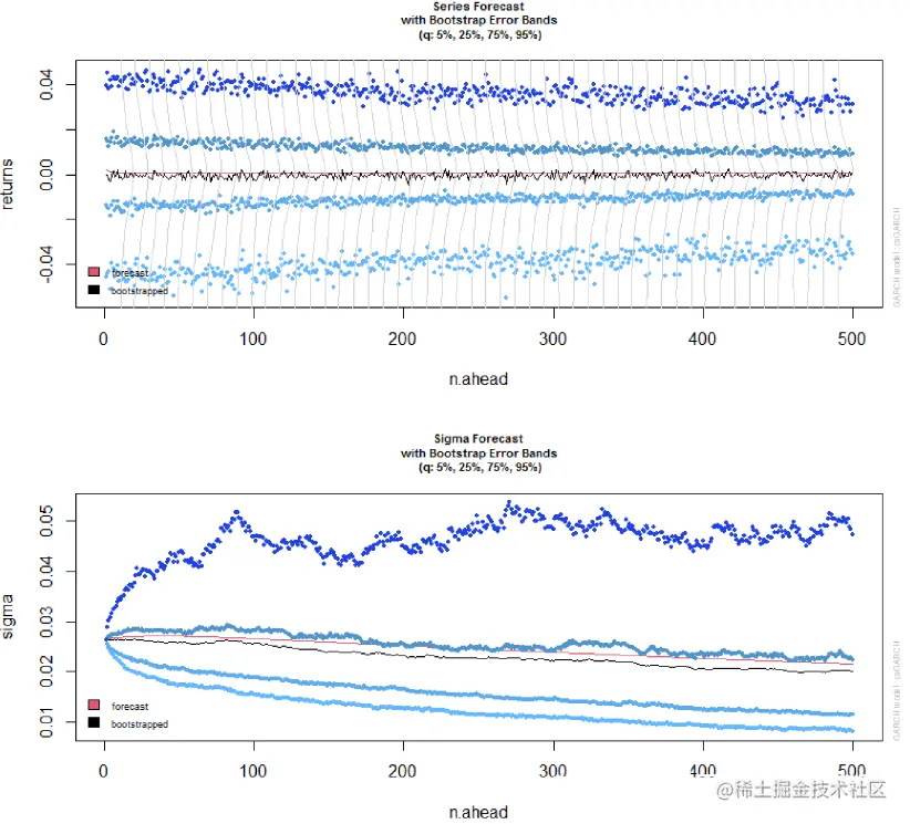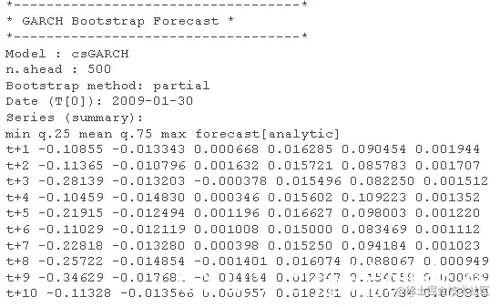 2 种类型的预测。一种滚动方法,其中基于拟合例程中设置的 out.sample 选项创建连续 1-ahead 预测,以及用于 n>1 超前预测的无条件方法。(也可以将两者结合起来创建一个相当复杂的对象)。在后一种情况下,也可以使用 Pascual 等人描述的 bootstrap程序。 bootstrap 方法基于从拟合模型的经验分布中重新采样标准化残差,以生成序列和 sigma 的未来实现。实现了两种方法:一种通过模拟和重新拟合建立参数的模拟分布来考虑参数不确定性,另一种只考虑分布不确定性,从而避免昂贵且冗长的参数分布估计。在后一种情况下,1-ahead sigma 预测的预测区间将不可用,因为在这种情况下,只有参数不确定性与 GARCH 类型模型相关。