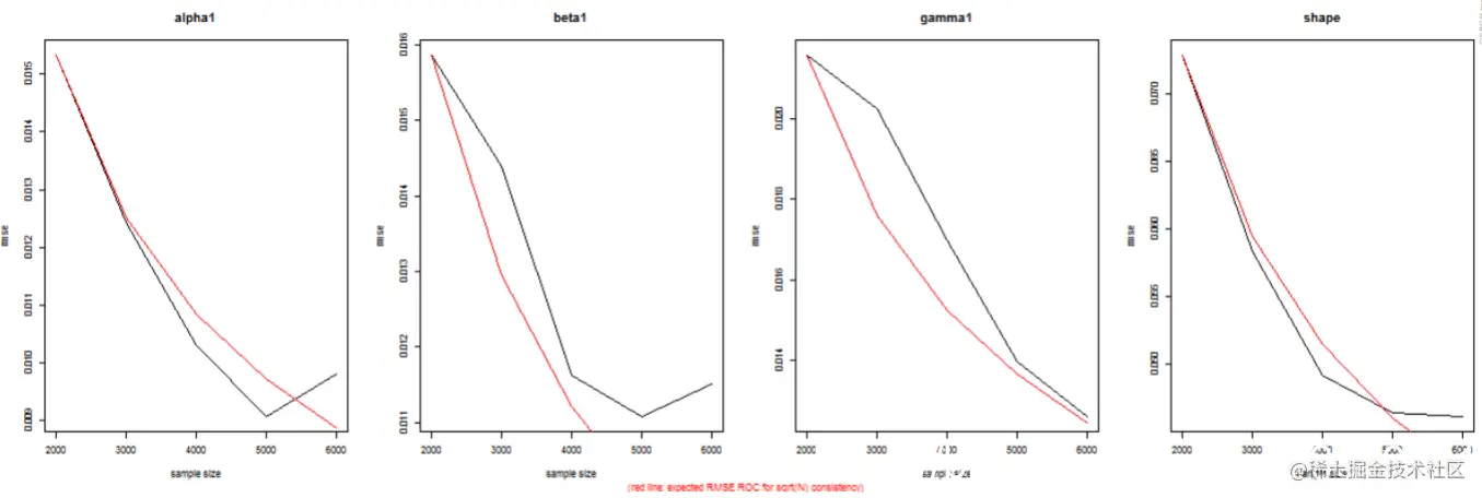 通过多次模拟和拟合模型并针对不同的“窗口”大小来执行蒙特卡罗实验。这允许通过查看均方根误差的下降率以及我们是否具有 √ N 一致性,在数据窗口增加时对参数估计的一致性有所了解。