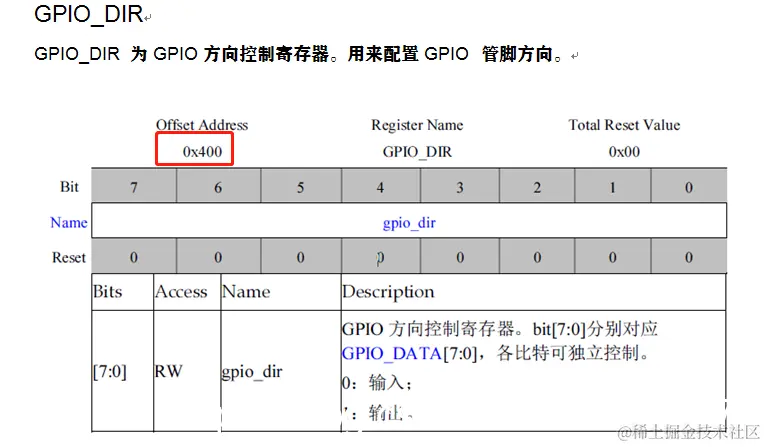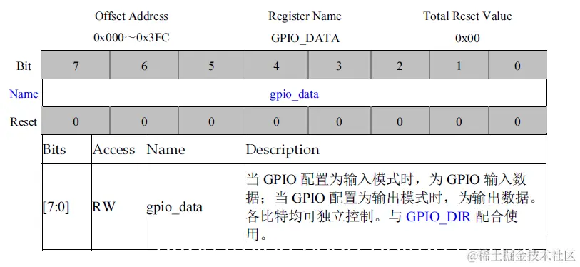 GPIO_DATA为GPIO数据寄存器,用来对输入或输出数据进行缓存;当配置GPIO_DIR中对应位为输出时,写入GPIO_DATA 寄存器的值将会输出到相应的管脚(注意需要配置正确的管脚复用);如果配置为输入时,将会读取相应输入管脚的值。