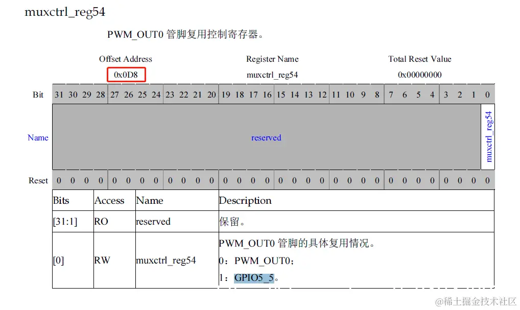 按照上面说明,只需要把muxctrl_reg54复用寄存器配置为0,即为PWM_OUT0功能,